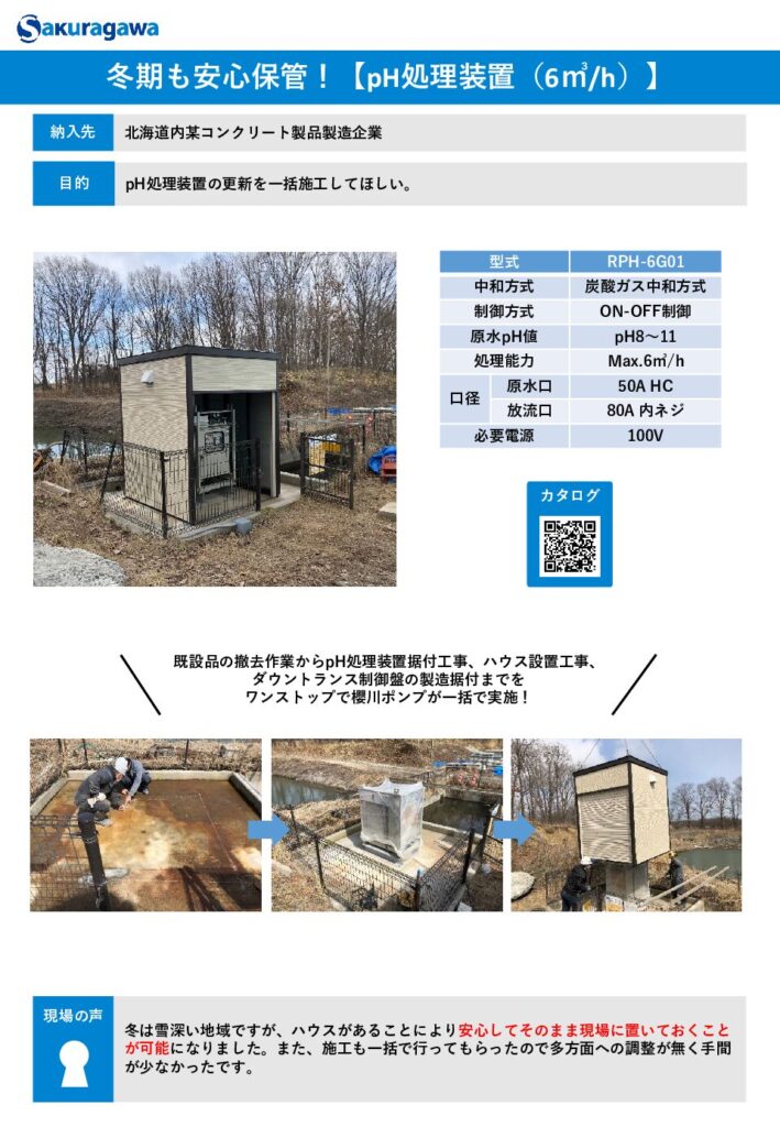 pH処理装置の更新を一括施工しました。 冬は雪深い地域ですが、ハウスがあることにより安心してそのまま現場に置い…製品名:pH処理装置(6㎥ / h )pH処理装置(6㎥ / h )「緊急時に大量排水、現場を止めない」センサー式オートポンプ
