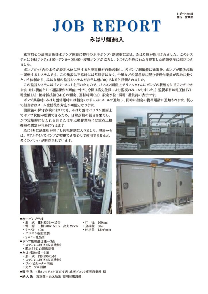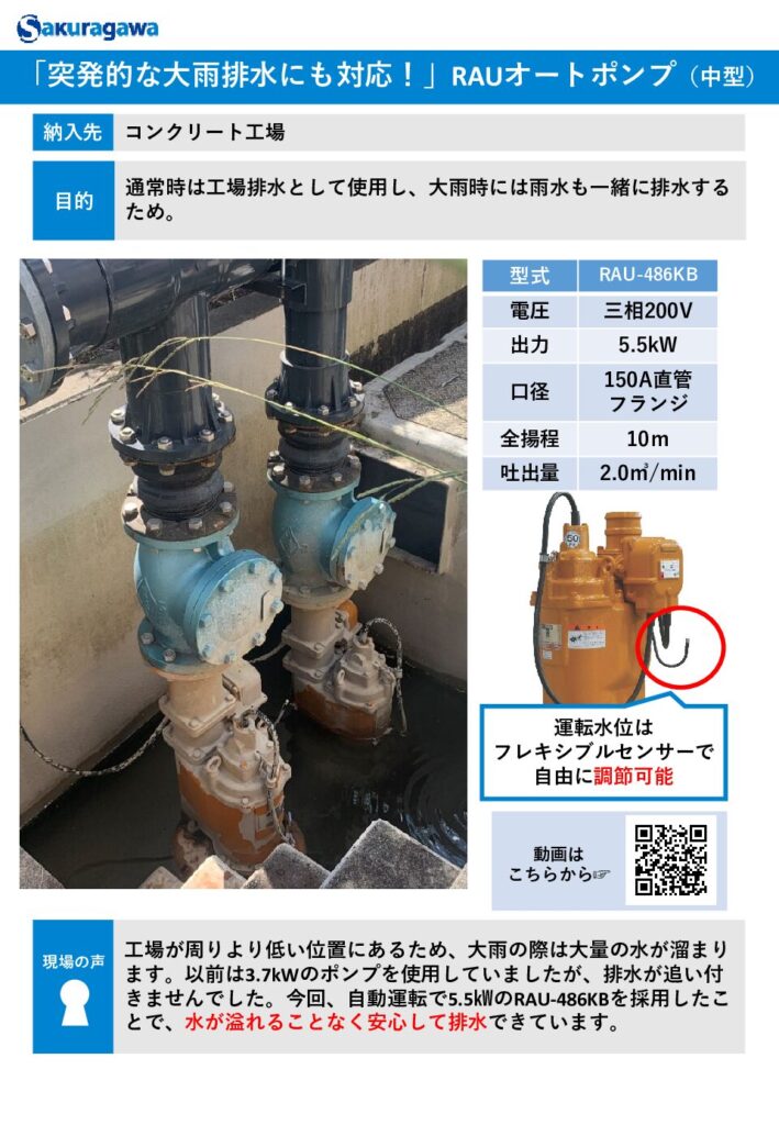 河川に面した発電所内の更新工事の期間、現場内の浸水を防ぐため3台設置し排水しました。普段水量の変化は少ないです…オートポンプユニット(センサー式)