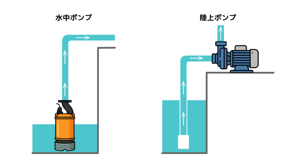 ポンプは設置場所によって、水の中に沈めて使う「水中ポンプ」と、陸の上に置いて使う「陸上ポンプ」の2種類に分けられます。
