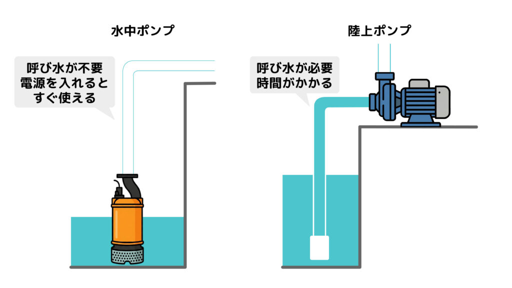 陸上ポンプは使用前にポンプや配管内を水で満たす「呼び水」が必要ですが、水中ポンプは最初から水没しているため、スイッチ一つですぐに起動できます。