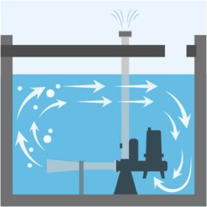 エジェクター作用により吸い込んだ空気をジェット水流とともに噴射し、撹拌と曝気を同時に行います。