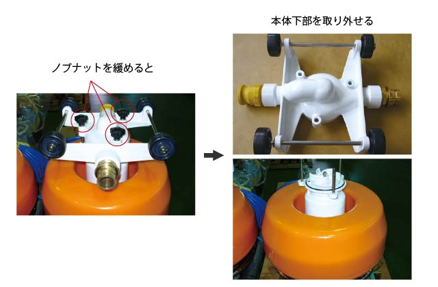 工具を使わず、手でノブナットを緩めて本体下部を取り外せます。