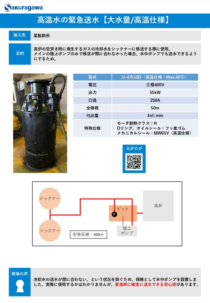 「高温水の緊急送水」大水量・高温仕様ポンプ